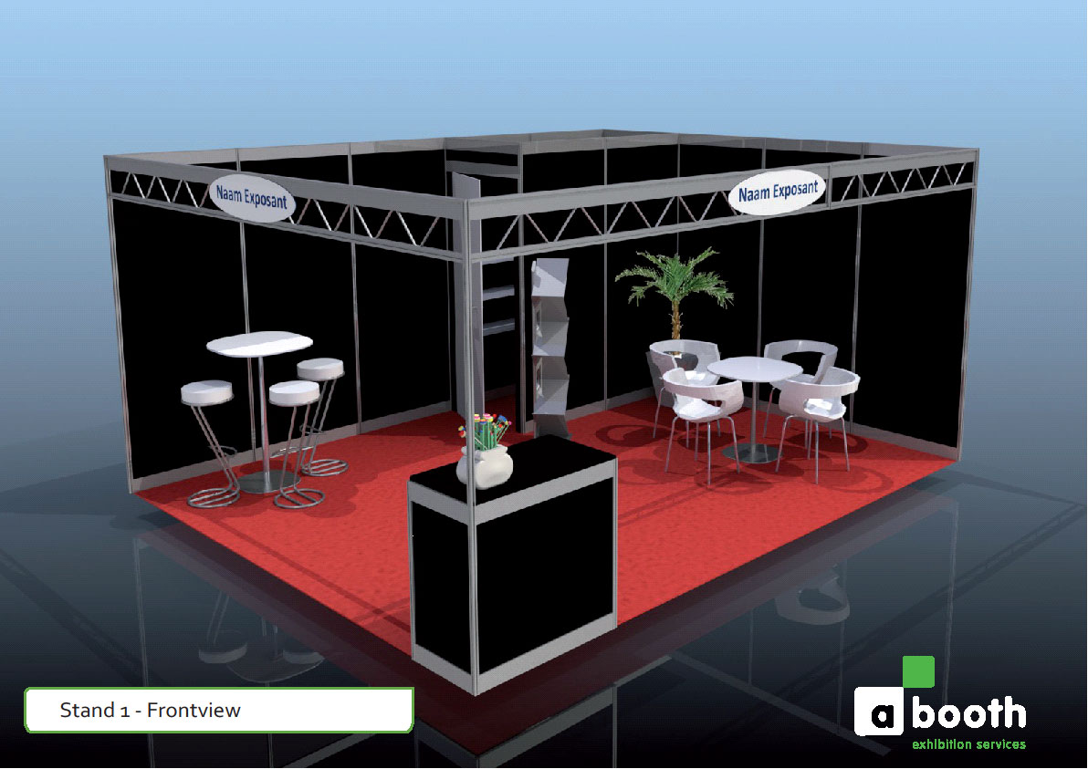 Wanden ( kleur wit), opbergkast met afsluitbare deur, vloerbedekking (kleur naar keuze), verlichting 2 x 4 spots op rail, balie, statafel met 3 barkrukken of ronde lage tafel met 4 luxe stoelen, op- en afbouw zoals met de organisatie is overeengekomen.